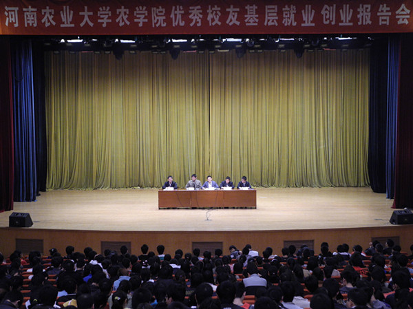 优秀校友基层就业创业报告会正在这里举行,会议邀请学院近三年毕业的优秀基层校友温振、王灵光创业团队回到母校作报告。院07级校友、青年大学生创业之星、漯河市德行丰民种植专业合作社理事长王灵光现场向广大学生发出邀请,欢迎同学们加入到他的创业团队一道创业。