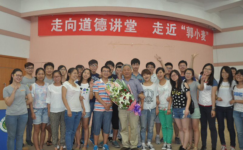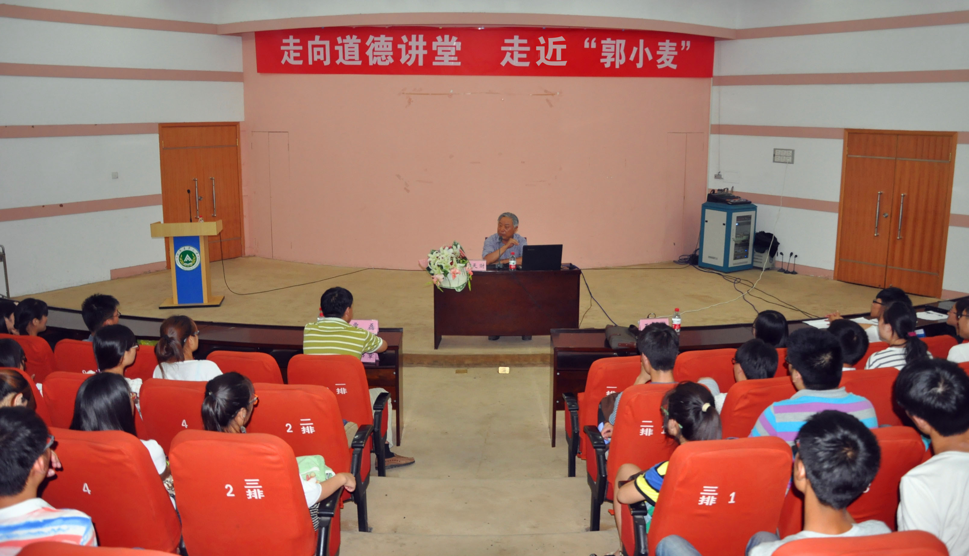 “走向道德讲堂 走近‘郭小麦’”郭天财教授报告会在校三百人报告厅举行。中原学者、全国先进工作者郭天财教授为丝袜av