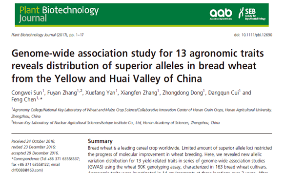 陈锋教授科研团队在植物学领域知名期刊Plant Biotechnology Journal(SCI影响因子6.09)上发表一篇题名为Genome-wide association study for 13 agronomic traits reveals distribution of superior alleles in bread wheat from the Yellow and Huai Valley of China的学术论文。丝袜av