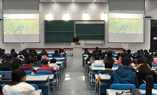 报告会上,郭天财教授首先向我们阐述了河南小麦播种基础及河南冬前小麦苗情分析。其次介绍了今年河南省小麦生产存在的问题和当前降温降雪对小麦的影响。并且就这些问题介绍了河南省春季麦田管理技术措施及方案。郭天财教授的报告内容丰富,层次分明,却又相互联系,让人听的聚精会神。