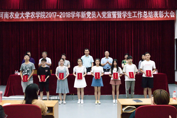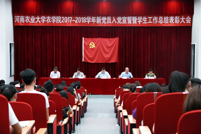 在龙子湖校区教学楼AB间大教室举行2017-2018学年新党员入党宣誓暨学生工作总结表彰大会。学院党政领导班子、院办公室、院团委老师以及教师代表出席此次大会。参加大会的有全体新党员、学生工作获奖者代表和本专科生、研究生代表。会议由院党委副书记吴旭静主持。