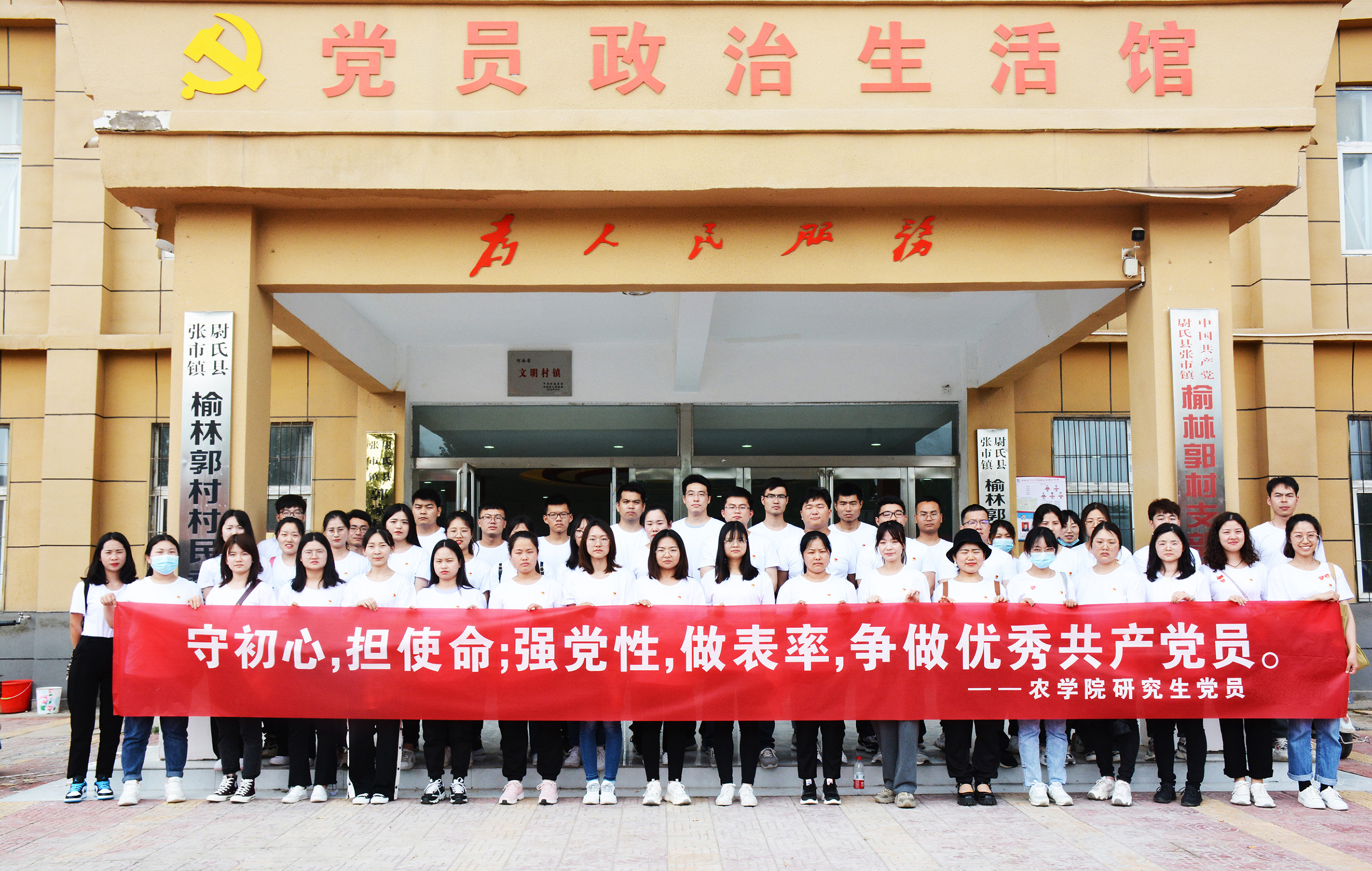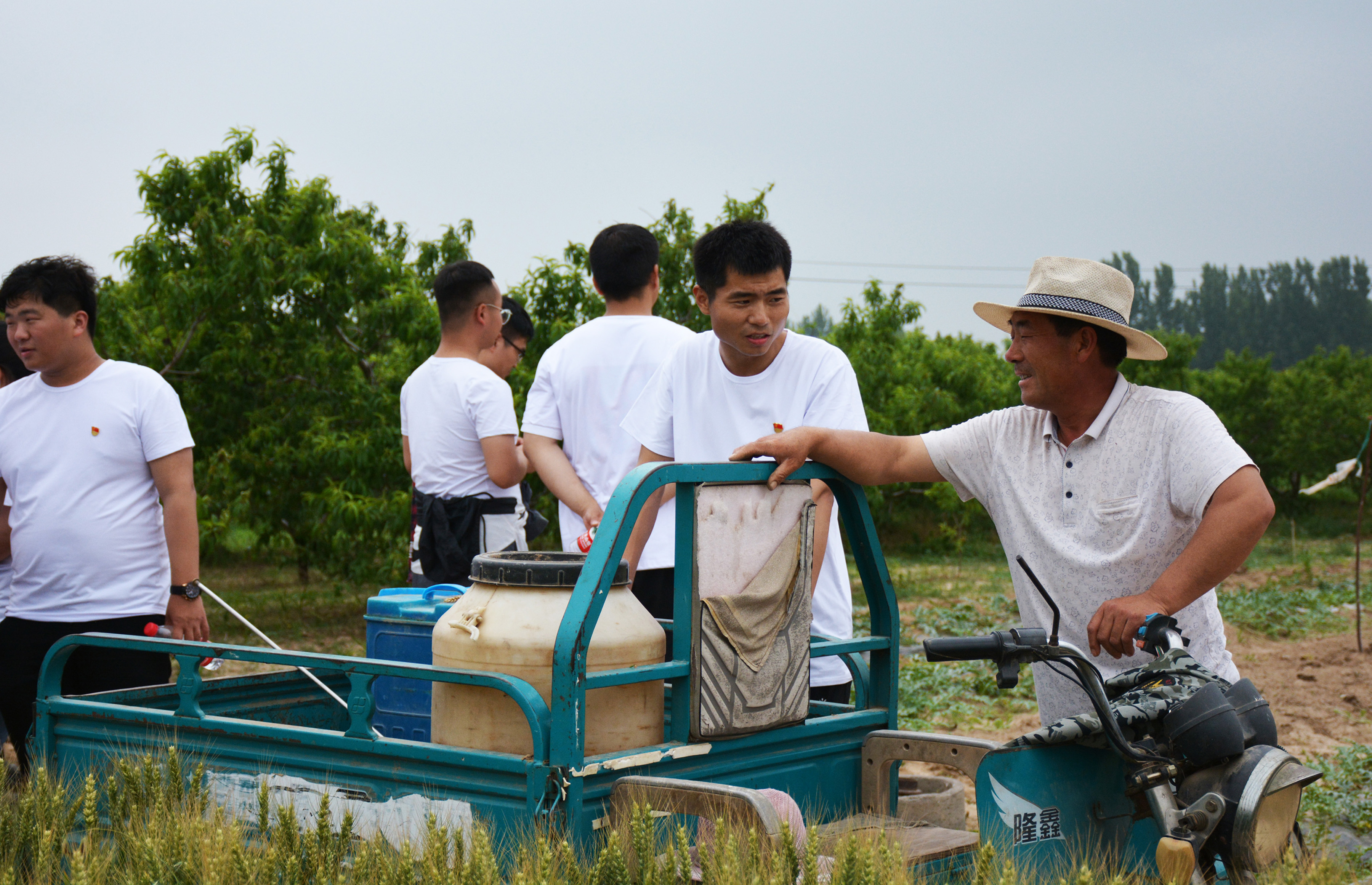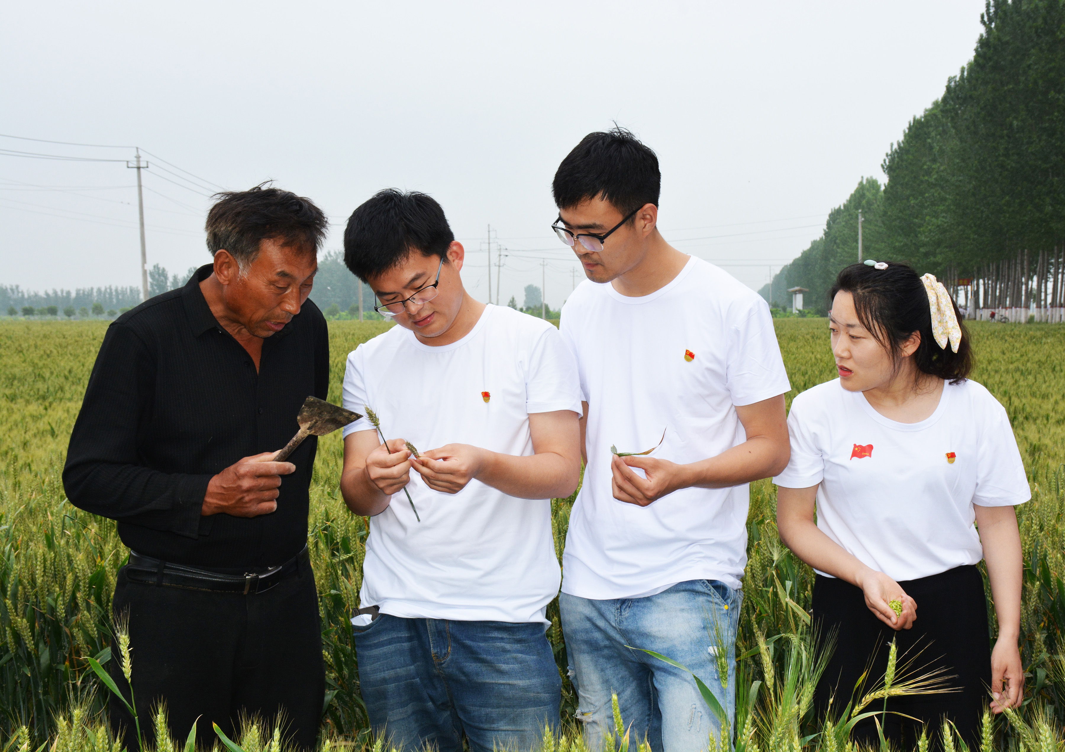 参观学习结束后,研究生党员又赶往榆林郭村大桃种植基地、小麦种植基地。就病虫害防治、树形修剪等方面的问题与村干部和园区工人进行交流,并对农户种植的冬小麦出现的茎基腐病、白粉病进行了评估分析,对种植户最关心的防治病虫害、农药施用、种植密度、收获最佳时间、小麦品种品质优化等进行详细解答和建议。