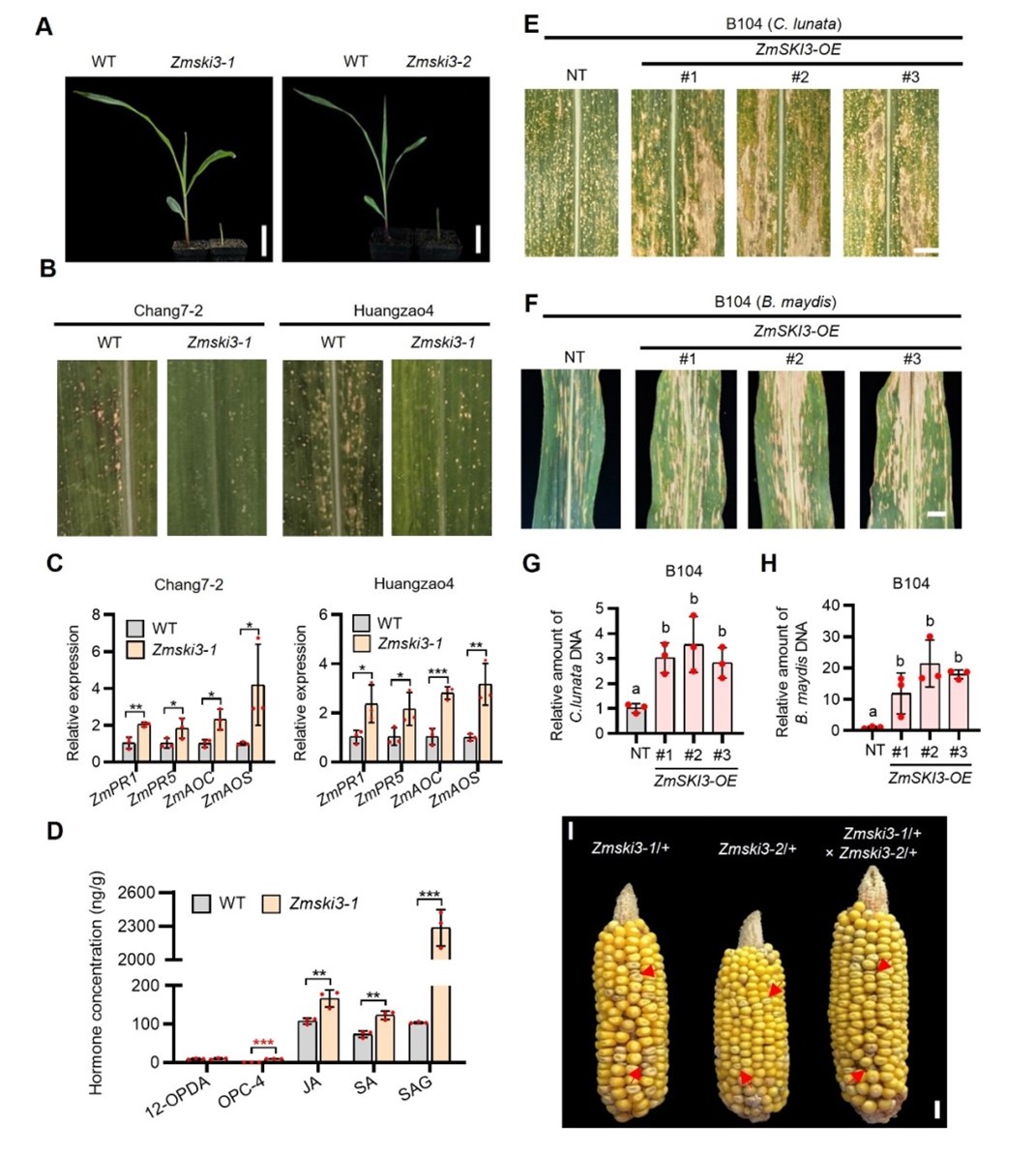 Zmski3突变体对弯孢叶斑病的抗性明显增强,而过表达