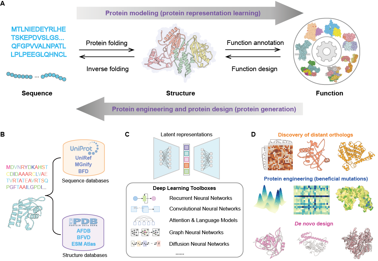 目前,人工智能,尤其是深度学习技术,极大地革新了生物数据的获取与分析方式,推动了生物技术、医学和农业等多个领域的突破。数十年来,"序列-结构-功能"范式始终指导着蛋白质研究。如今,深度学习正通过蛋白质表征学习重塑这一范式-其不仅能破译复杂生物模式,更实现了AI驱动的蛋白质设计与改造(图1)。以CRISPR/Cas系统为主的基因组编辑技术已在基础研究、农业育种和生物医药等领域展现出巨大的应用潜力,然而如何高效发现、设计与改造新型基因组编辑工具仍是难以解决的领域瓶颈。